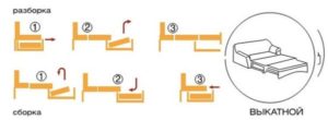 Способ раскладывания : потянуть за потайной ремешок и выдвинуть до полного разложения, откинуть подушки или матрац назад.