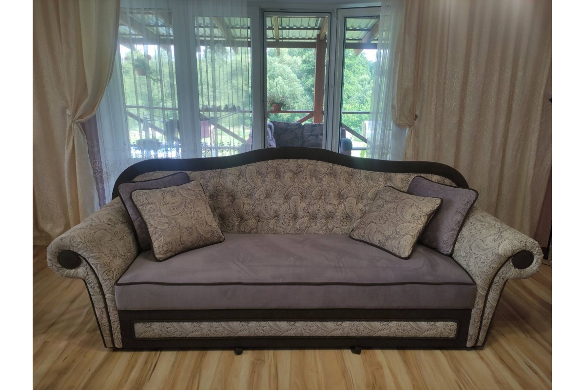 Диван-кровать Людмила — современная классическая модель с оригинальным дизайном спинки и боковин. Верхнее сидение на основе пружинного блока и пружинной змейки. Выдвижное сидение на основе пружинного блока. Спинка на основе пенополиуретана. В разложенном виде представляет 2-х спальную кровать. Так как выдвижная часть дивана находится под основным сидением, отсутствует короб для хранения. Основание сидения – пиломатериалы хвойных пород. В комплект входят 4 декоративные подушки. Может изготавливаться в разных цветовых решениях. Механизм трансформации — «пума»