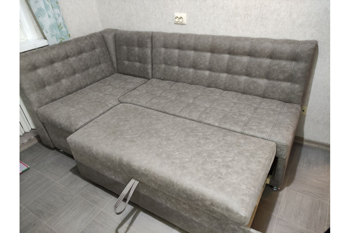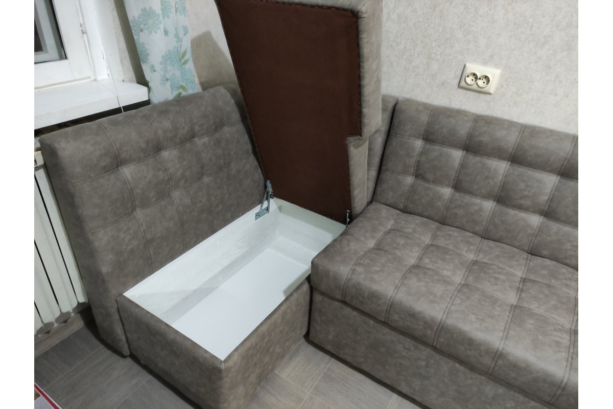 Большой кухонный уголок ЛОФТ с отсеком для хранения вещей. Одно из преимуществ — дополнительное спальное место: низ выдвигается и образовывается вместительная полуторка. Преимущество в наполнении ППУ — уголок восстанавливает первоначальную форму, у вас не будет аллергии на наполнитель, так как он гипоаллергенен. Вам будет удобно проводить влажную уборку уголка, так как он быстро высохнет благодаря хорошей воздухопроницаемости. Последнее важный момент, если в доме есть маленькие дети. Есть место для хранения вещей.